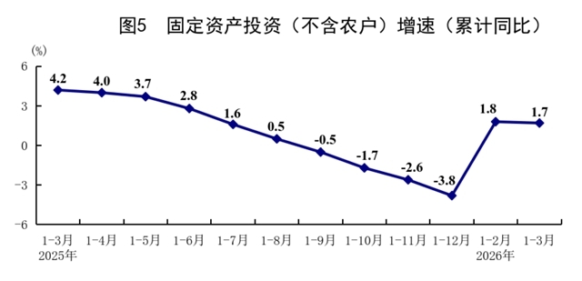 一季度,全國(guó)固定資產(chǎn)投資(不含農(nóng)戶)102708億元,同比增長(zhǎng)1.7%,上年全年為下降3.8%;扣除房地產(chǎn)開(kāi)發(fā)投資,全國(guó)固定資產(chǎn)投資增長(zhǎng)4.8%。分領(lǐng)域看,基礎(chǔ)設(shè)施投資同比增長(zhǎng)8.9%,制造業(yè)投資增長(zhǎng)4.1%,房地產(chǎn)開(kāi)發(fā)投資下降11.2%。全國(guó)新建商品房銷售面積19525萬(wàn)平方米,同比下降10.4%;新建商品房銷售額17262億元,下降16.7%。分產(chǎn)業(yè)看,第一產(chǎn)業(yè)投資同比增長(zhǎng)15.9%,第二產(chǎn)業(yè)投資增長(zhǎng)5.8%,第三產(chǎn)業(yè)投資下降1.0%。民間投資同比下降2.2%,降幅比上年全年收窄4.2個(gè)百分點(diǎn);扣除房地產(chǎn)開(kāi)發(fā)投資,民間投資增長(zhǎng)1.3%。高技術(shù)產(chǎn)業(yè)投資同比增長(zhǎng)7.4%,其中計(jì)算機(jī)及辦公設(shè)備制造業(yè),航空、航天器及設(shè)備制造業(yè),信息服務(wù)業(yè)投資分別增長(zhǎng)28.3%、19.0%、20.9%。3月份,固定資產(chǎn)投資(不含農(nóng)戶)環(huán)比增長(zhǎng)0.52%。
