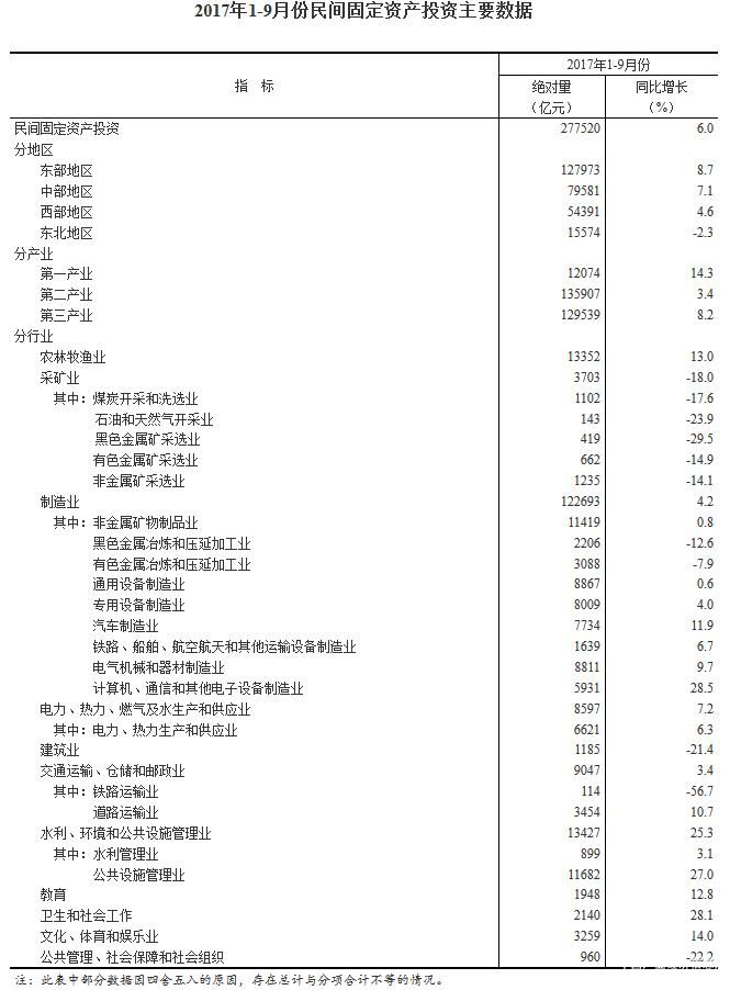 分地區(qū)看,東部地區(qū)民間固定資產(chǎn)投資127973億元,同比增長8.7%,增速比1-8月份回落0.5個百分點;中部地區(qū)79581億元,增長7.1%,增速提高0.3個百分點;西部地區(qū)54391億元,增長4.6%,增速回落0.8個百分點;東北地區(qū)15574億元,同比下降2.3%,降幅收窄3.8個百分點。