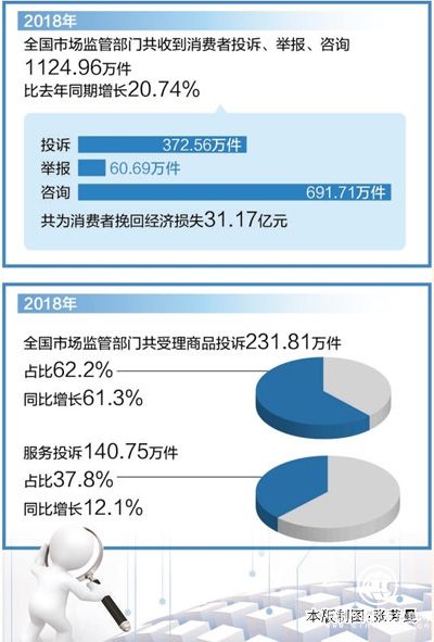 2018年,全國市場監(jiān)管部門共收到消費(fèi)者投訴、舉報(bào)、咨詢1124.96萬件,比去年同期增長20.74%。其中,投訴372.56萬件,舉報(bào)60.69萬件,咨詢691.71萬件,共為消費(fèi)者挽回經(jīng)濟(jì)損失31.17億元。主要呈現(xiàn)八大特點(diǎn):
