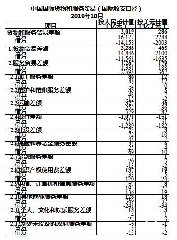 2019年10月,我國國際收支口徑的國際貨物和服務(wù)貿(mào)易收入16177億元,支出14158億元,順差2019億元。其中,貨物貿(mào)易收入14846億元,支出11561億元,順差3286億元;服務(wù)貿(mào)易收入1331億元,支出2598億元,逆差1267億元。