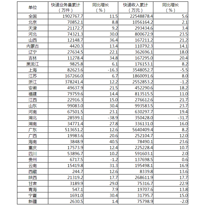 分省快遞服務(wù)企業(yè)業(yè)務(wù)量和業(yè)務(wù)收入情況表