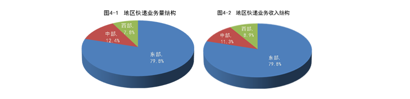 1-4月份,東、中、西部地區(qū)快遞業(yè)務(wù)量比重分別為79.8%、12.4%和7.8%,業(yè)務(wù)收入比重分別為79.8%、11.3%和8.9%。與去年同期相比,東部地區(qū)快遞業(yè)務(wù)量比重持平,快遞業(yè)務(wù)收入比重下降0.5個(gè)百分點(diǎn);中部地區(qū)快遞業(yè)務(wù)量比重下降0.3個(gè)百分點(diǎn),快遞業(yè)務(wù)收入比重上升0.2個(gè)百分點(diǎn);西部地區(qū)快遞業(yè)務(wù)量比重上升0.3個(gè)百分點(diǎn),快遞業(yè)務(wù)收入比重上升0.3個(gè)百分點(diǎn)。