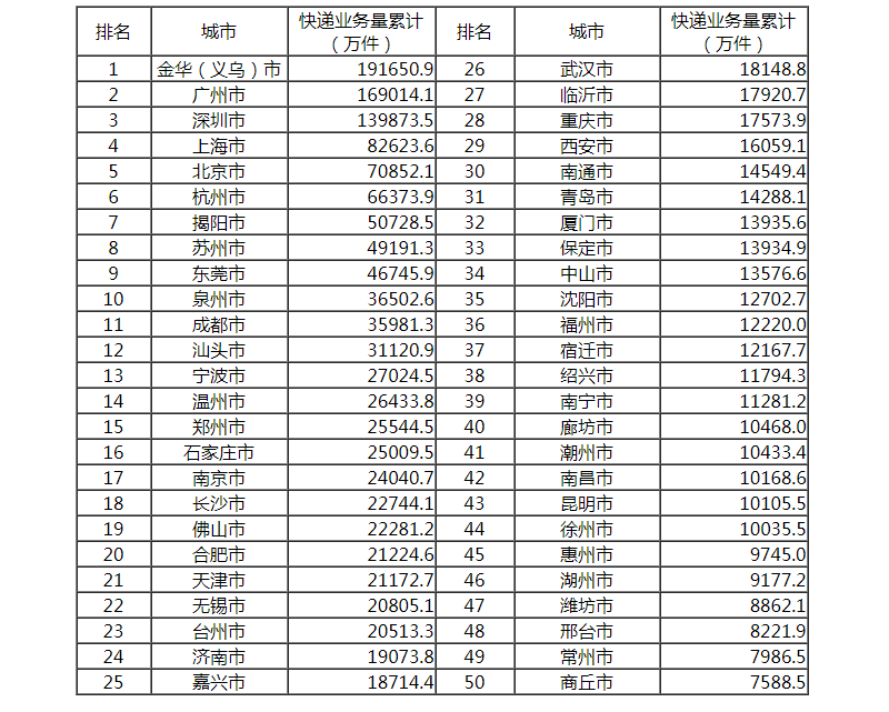 快遞業(yè)務(wù)量前50位城市情況表