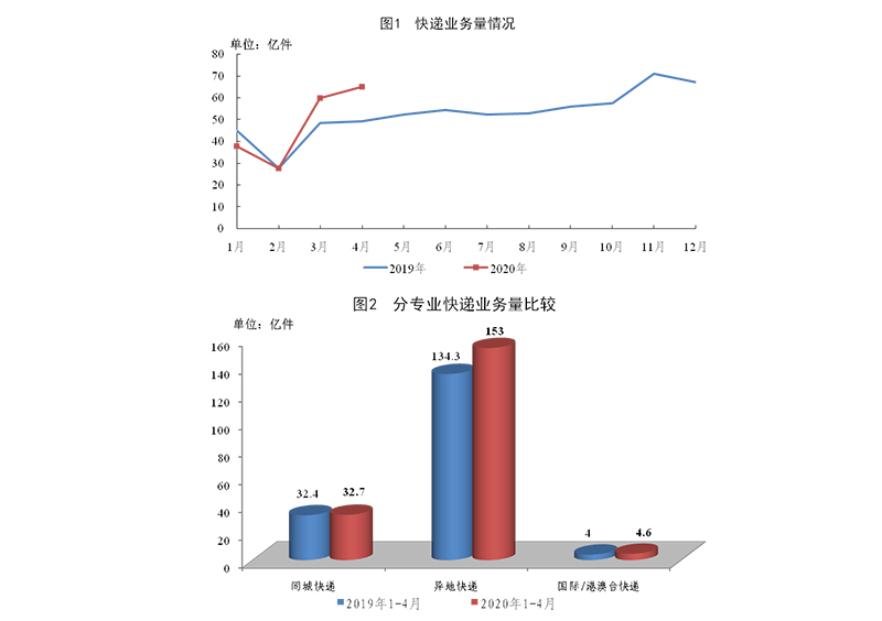 4月份,全國(guó)快遞服務(wù)企業(yè)業(yè)務(wù)量完成65億件,同比增長(zhǎng)32.1%;業(yè)務(wù)收入完成720.9億元,同比增長(zhǎng)21.7%。