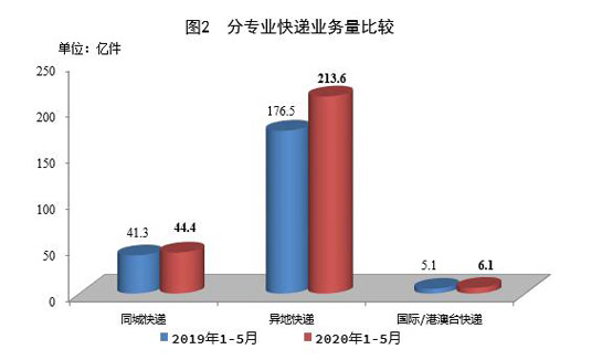 1-5月份,同城、異地、國際/港澳臺快遞業(yè)務(wù)量分別占全部快遞業(yè)務(wù)量的16.8%、80.9%和2.3%;業(yè)務(wù)收入分別占全部快遞收入的9.6%、51.2%和12.1%。與去年同期相比,同城快遞業(yè)務(wù)量的比重下降1.7個百分點,異地快遞業(yè)務(wù)量的比重上升1.7個百分點,國際/港澳臺業(yè)務(wù)量的比重持平。