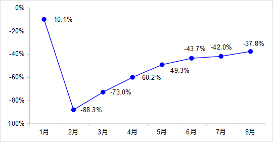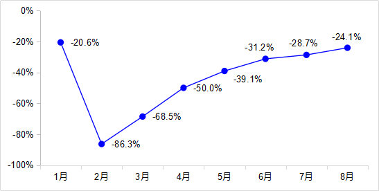 1—8月,完成營業(yè)性客運量58.3億人,同比下降50.9%。其中,公路營業(yè)性客運量下降51.5%、水路客運量下降52.6%。
