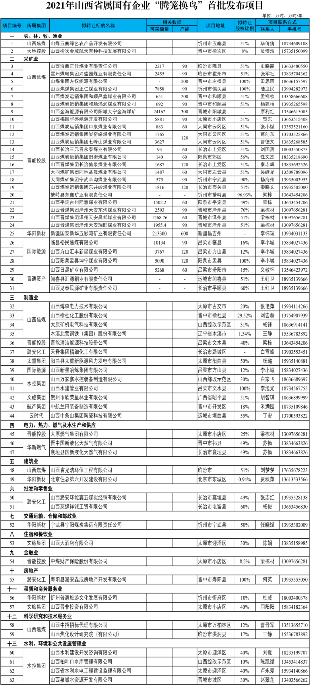 3月26日,山西省國資運營公司發(fā)布《2021年山西省屬國有企業(yè)“騰籠換鳥”首批發(fā)布項目》,包括采礦業(yè)、制造業(yè)、建筑業(yè)等13大類63個項目。采礦業(yè)中,晉能控股就一攬子拋出了18個“騰籠換鳥”項目,山西焦煤也有4個項目,有的擬轉(zhuǎn)讓股權(quán)比例達(dá)100%。