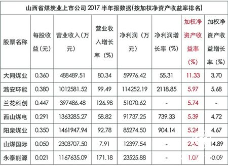 記者對(duì)山西7家上市煤炭為主的公司半年報(bào)進(jìn)行了分析,發(fā)現(xiàn)所有公司2017年上半年均有盈利,且利潤(rùn)都有不同程度的增長(zhǎng):大同煤業(yè)實(shí)現(xiàn)凈利潤(rùn)59976.42萬(wàn)元,加權(quán)平均凈資產(chǎn)收益率為11.33%;潞安環(huán)能實(shí)現(xiàn)凈利潤(rùn)114252.19萬(wàn)元,加權(quán)平均凈資產(chǎn)收益率為5.97%;蘭花科創(chuàng)實(shí)現(xiàn)凈利潤(rùn)51070.62萬(wàn)元,加權(quán)平均凈資產(chǎn)收益率為5.74%;西山煤電實(shí)現(xiàn)凈利潤(rùn)91737.25萬(wàn)元,加權(quán)平均凈資產(chǎn)收益率為5.39%;陽(yáng)泉煤業(yè)實(shí)現(xiàn)凈利潤(rùn)85274.5萬(wàn)元,加權(quán)平均凈資產(chǎn)收益率為5.24%;山煤國(guó)際實(shí)現(xiàn)凈利潤(rùn)12397.54萬(wàn)元,加權(quán)平均凈資產(chǎn)收益率為2.46%;永泰能源實(shí)現(xiàn)凈利潤(rùn)23525.88萬(wàn)元,加權(quán)平均凈資產(chǎn)收益率為1.07%。