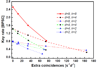 圖2:實(shí)驗(yàn)結(jié)果圖。橫坐標(biāo)為環(huán)境噪聲的強(qiáng)度??v坐標(biāo)為每對(duì)光子能產(chǎn)生的密鑰比特?cái)?shù)。其中d為糾纏態(tài)的維度數(shù),k為子空間的維度數(shù)。最下邊的一條線對(duì)應(yīng)兩維比特系統(tǒng)。