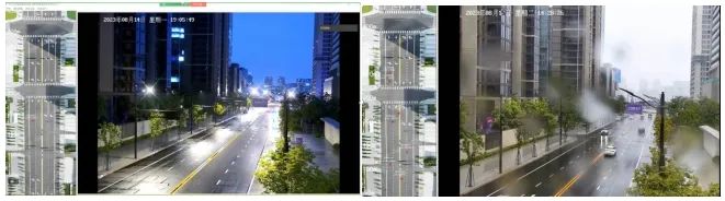 黑夜天和雨霧天車輛內(nèi)可獲取超視距感知畫面(右側(cè)為攝像頭視距內(nèi)畫面,左側(cè)為通感基站對(duì)道路全景的感知孿生)