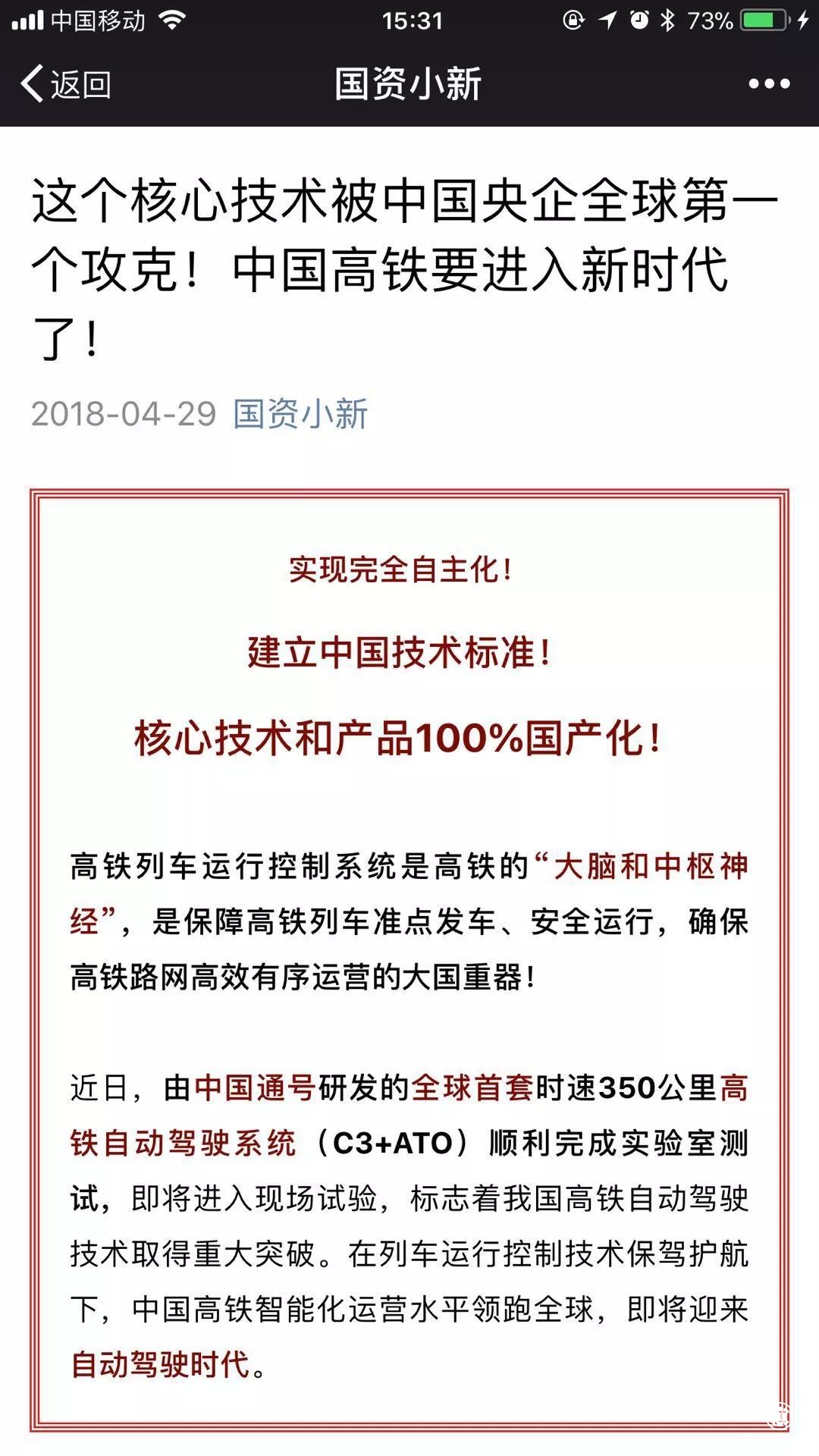由“中國通號”研發(fā)的全球首套時速350公里高鐵自動駕駛系統(tǒng)(C3+ATO)順利完成實驗室測試,即將進入現(xiàn)場試驗,標志著我國高鐵自動駕駛技術取得重大突破——高鐵的自動駕駛時代到來了!