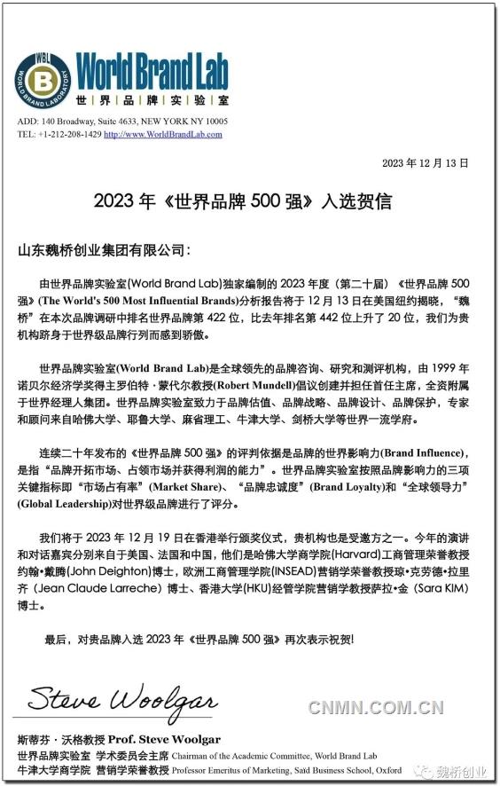 由世界品牌實(shí)驗(yàn)室(World Brand Lab) 獨(dú)家編制的2023年度(第二十屆)《世界品牌500強(qiáng)》(The World's 500 Most Influential Brands)排行榜于12月13日在美國(guó)紐約揭曉,“魏橋”在本次品牌調(diào)研中排名世界品牌500強(qiáng)第422位,比去年上升了20位,這是魏橋創(chuàng)業(yè)集團(tuán)連續(xù)5年上榜世界品牌500強(qiáng)。