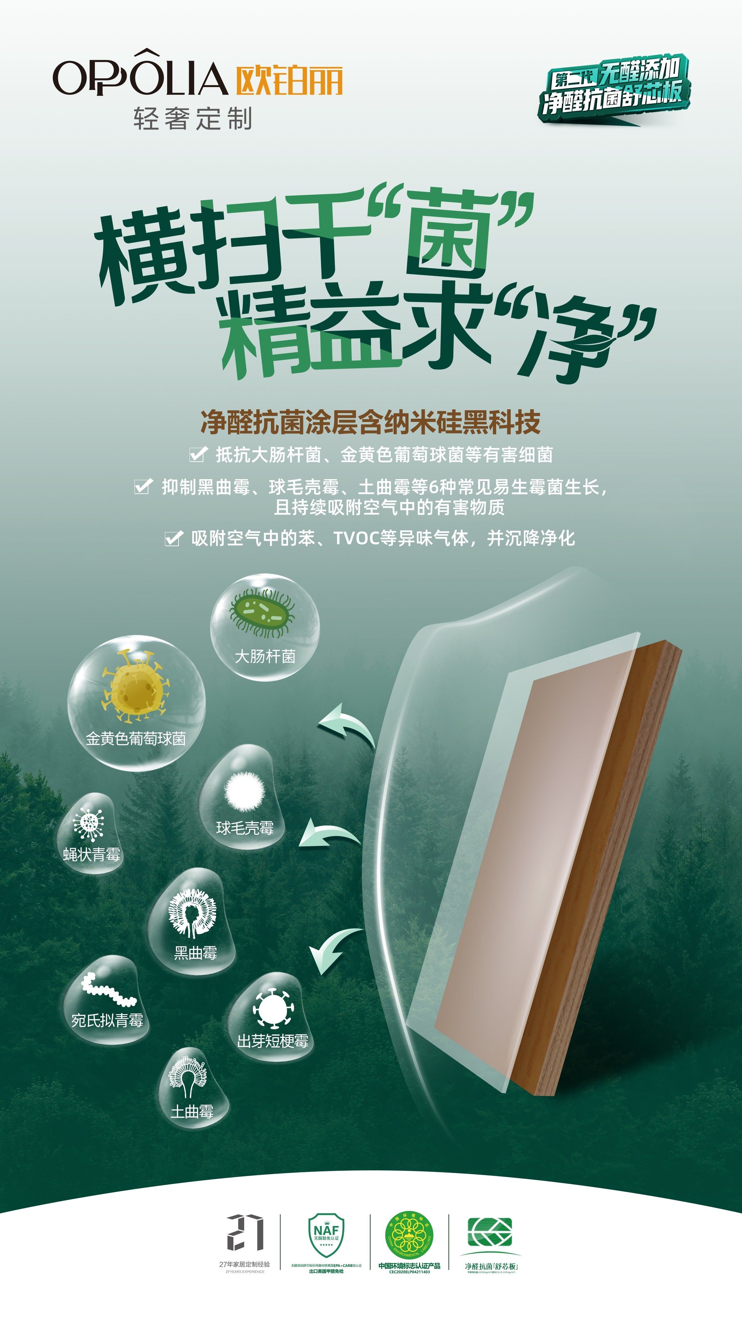 歐鉑麗一直致力于“無(wú)醛環(huán)保、綠色健康”的選材選品,產(chǎn)品可同時(shí)實(shí)現(xiàn)凈醛 、抗菌 、防霉 、凈TVOC等多重功效,如此次獲獎(jiǎng)的全能系列新品【簡(jiǎn)·赫拉】選用的“凈醛抗菌三聚氰胺貼面板”以及全能系列新品【奢·星瀾】柜身應(yīng)用的“抗菌實(shí)木顆粒板”,均從源頭上保證產(chǎn)品的安全健康,實(shí)力守護(hù)家人身體健康,締造綠色環(huán)保的人居生活。