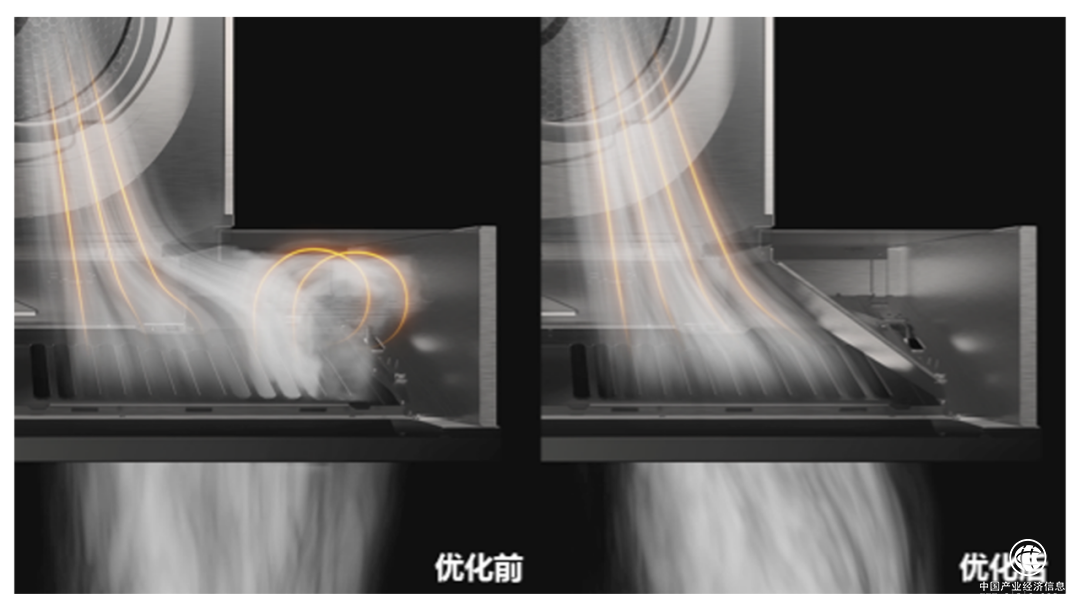 為了讓上排更高效,集成烹飪中心為煙機(jī)創(chuàng)新出反向背吸技術(shù),同時(shí)參照火箭整流罩氣動(dòng)減阻原理,在進(jìn)風(fēng)通道增加整流減阻結(jié)構(gòu),使氣體流動(dòng)效率增加近2倍而噪音下降3分貝,整體大大增強(qiáng)了攏煙效率、縮短了油煙路徑。