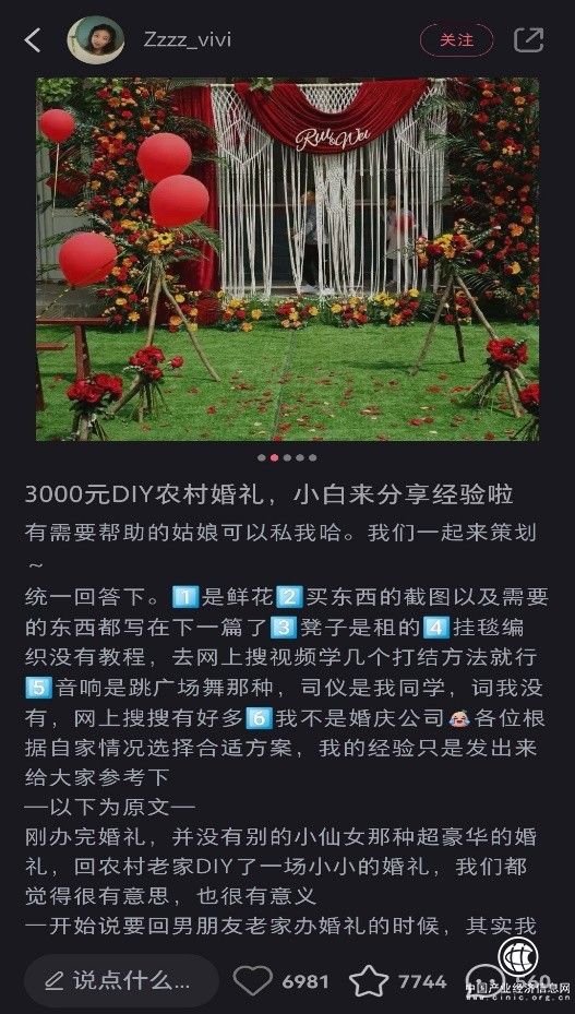 博主Zzzz_vivi就在小紅書(shū)曬出了自己的農(nóng)村婚禮。從丈量場(chǎng)地、草圖設(shè)計(jì)、到婚禮現(xiàn)場(chǎng)調(diào)度指揮,張女士和老公全程DIY,把自己的婚禮“操辦成了藝術(shù)品”。她的小紅書(shū)筆記至今已被30多萬(wàn)人觀看,很多人留言表示自己婚禮也要“抄作業(yè)”。