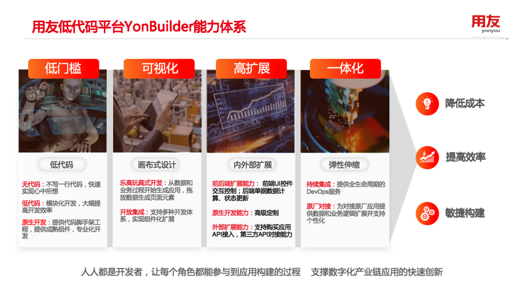 用友iuap的低代碼開發(fā)平臺(tái)通過(guò)通過(guò)低代碼數(shù)據(jù)分析、低代碼應(yīng)用開發(fā)、低代碼區(qū)塊鏈構(gòu)建、低代碼集成鏈接、低代碼AI開發(fā)五大體系化、智能化的能力,覆蓋從公民開發(fā)者到專業(yè)開發(fā)者的全領(lǐng)域人群,大幅提升開發(fā)效率,實(shí)現(xiàn)開發(fā)大眾化、普惠化,加快產(chǎn)業(yè)互聯(lián)網(wǎng)平臺(tái)的應(yīng)用建設(shè)速度與效率。