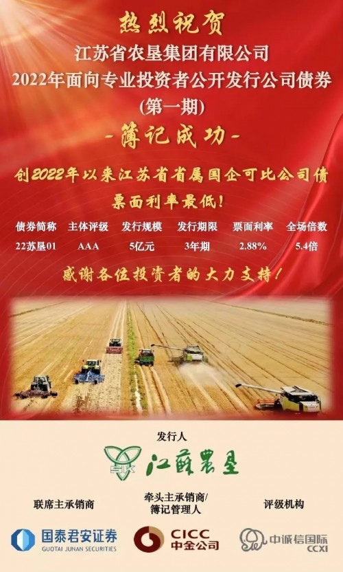 5月25日,由國泰君安承銷的“江蘇農(nóng)墾集團有限公司2022年面向?qū)I(yè)投資者公開發(fā)行公司債券(第一期)”在上海證券交易所成功發(fā)行。本期債券發(fā)行規(guī)模為5億元,期限為3年期,票面利率為2.88%,創(chuàng)2022年以來江蘇省屬國企可比公司債最低票面利率,成為國泰君安近期支持“三農(nóng)”、服務(wù)實體與產(chǎn)業(yè)客戶的又一經(jīng)典案例。