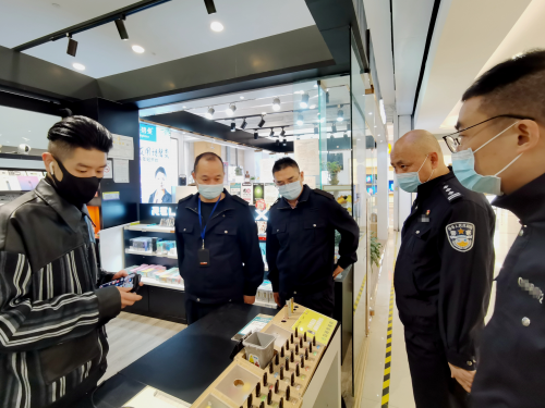 圖為:寧??h煙草專賣局工作人員聯(lián)合縣市場監(jiān)督管理局工作人員對電子煙零售店開展專項檢查。(王偉杰 攝)