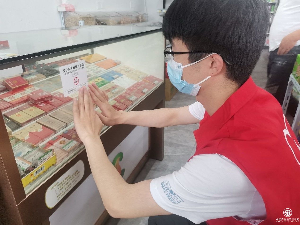 圖為 “香溢”志愿服務隊張貼禁止向未成年人銷售卷煙售標識規(guī)定