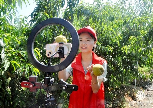 圖為“香溢”志愿者通過(guò)直播方式銷售黃桃。(潘曉棟 攝)