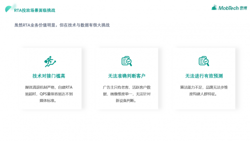 從RTA的概念不難看出,采用RTA投放模式,需要具備兩個(gè)先決條件:首先,廣告平臺(tái)需要具備大曝光能力的廣告平臺(tái),且具有較高的技術(shù)對(duì)接能力;同時(shí),廣告主需要具備海量的設(shè)備數(shù)據(jù)篩選能力,本身具有豐富足量的客戶(hù)數(shù)據(jù),且其客戶(hù)畫(huà)像數(shù)據(jù)維度豐富,支持各種“拉新”、“促活”、“交叉營(yíng)銷(xiāo)”等個(gè)性化場(chǎng)景;然而,在實(shí)際應(yīng)用中,RTA投放場(chǎng)景面臨諸多挑戰(zhàn),如技術(shù)對(duì)接門(mén)檻高、廣告主缺乏數(shù)據(jù)無(wú)法準(zhǔn)確判斷客戶(hù)、廣告主數(shù)據(jù)不足以進(jìn)行有效預(yù)測(cè)等。