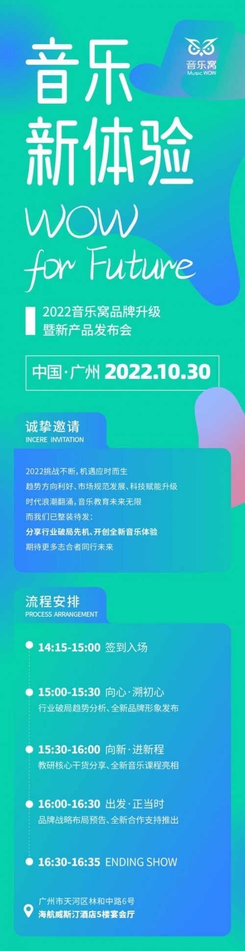 在10月30日,音樂窩也將迎來2022品牌升級暨產品發(fā)布會,屆時將分享音樂教育行業(yè)的破局先機,開創(chuàng)全新的音樂體驗,可通過音樂窩官方平臺預約報名參與,歡迎各位同道的有志人士蒞臨共掘新出路。
