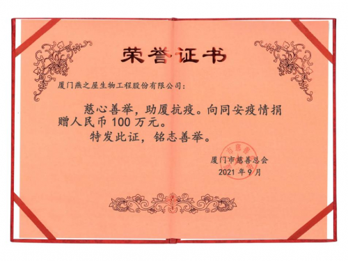 圖:燕之屋向同安疫情捐贈人民幣100萬元,獲廈門市慈善總會頒發(fā)榮譽證書