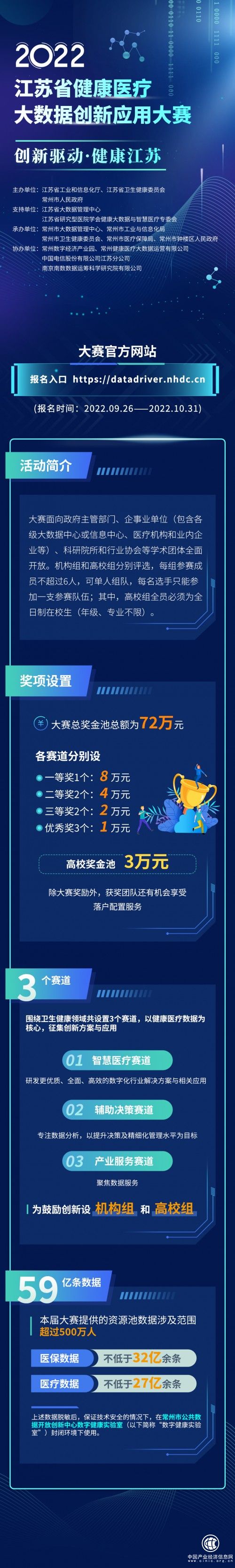 電子健康記錄、即時(shí)護(hù)理、“云端”診療……近年來(lái),健康醫(yī)療大數(shù)據(jù)的應(yīng)用逐步走進(jìn)大眾視野。為進(jìn)一步發(fā)揮其對(duì)衛(wèi)生健康事業(yè)的創(chuàng)新支撐作用,對(duì)健康醫(yī)療產(chǎn)業(yè)的引領(lǐng)賦能作用,9月26日,由江蘇省工業(yè)和信息化廳、江蘇省衛(wèi)生健康委員會(huì)、常州市人民政府聯(lián)合主辦的“創(chuàng)新驅(qū)動(dòng)·健康江蘇”——2022江蘇省健康醫(yī)療大數(shù)據(jù)創(chuàng)新應(yīng)用大賽(以下簡(jiǎn)稱(chēng)“大賽”)在國(guó)家健康醫(yī)療大數(shù)據(jù)(東部)中心火熱開(kāi)幕。