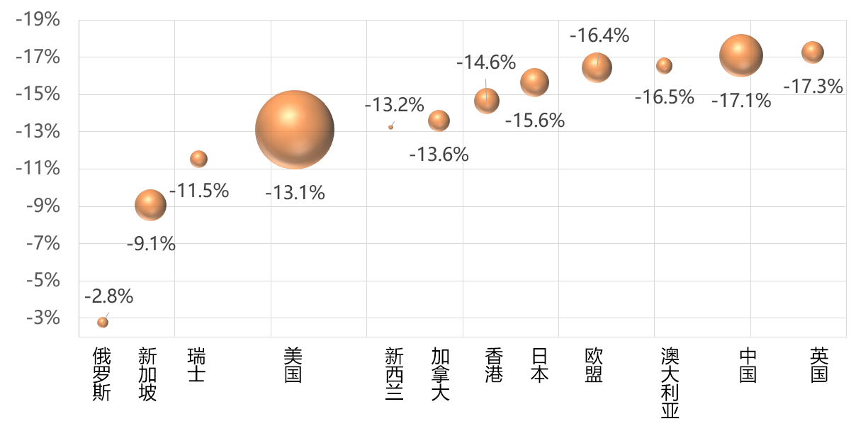 注:圖中球的面積代表各個(gè)權(quán)益市場(chǎng)的規(guī)模,美元化權(quán)益資產(chǎn)收益率 = (1+美元匯兌收益率)*(1+本幣權(quán)益收益率)-1,各個(gè)國(guó)家和地區(qū)選擇代表性股指分別為:俄羅斯MOEX、富時(shí)新加坡海峽指數(shù)、瑞士SMI、標(biāo)普500指數(shù)、新西蘭標(biāo)普50、加拿大S&P、恒生指數(shù)、日經(jīng)225、歐洲斯托克50指數(shù)、澳洲標(biāo)普200、萬(wàn)德全A、英國(guó)富時(shí)100。
