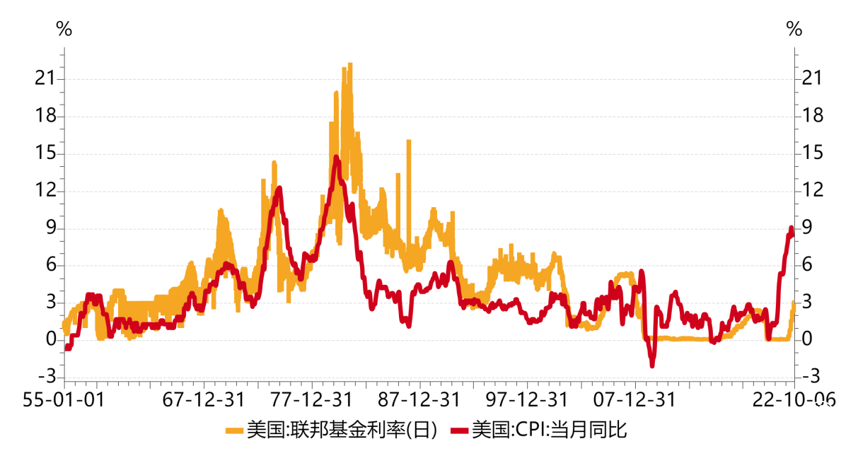 圖8 美國(guó)聯(lián)邦基金目標(biāo)利率和CPI同比走勢(shì)