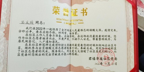 圖:燕之屋天津市場操盤手孫慶玲收到君禧華庭社區(qū)黨委的榮譽證書