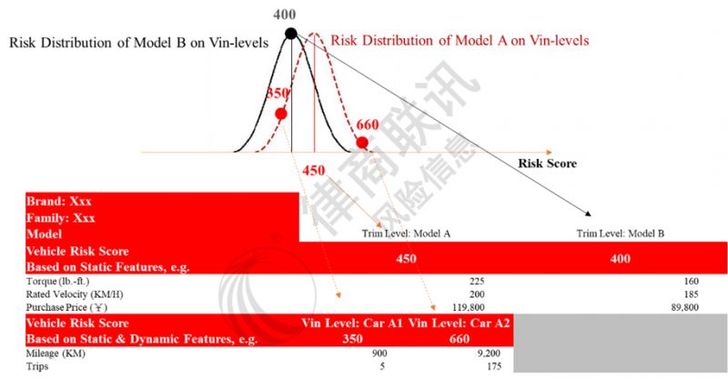 備注:車型A和車型B的靜態(tài)評(píng)分,分別為450分和400分;考慮每一車輛(VIN)動(dòng)態(tài)從用數(shù)據(jù)的差異,動(dòng)靜合一分將圍繞靜態(tài)車型分上下波動(dòng)。以車型A為例,某車輛A1因里程、行程等動(dòng)態(tài)信息相對(duì)平均風(fēng)險(xiǎn)傾向低風(fēng)險(xiǎn)方向,A1動(dòng)靜評(píng)分從450分移動(dòng)到350分;而車輛A2反之,從450分移動(dòng)到660分。圖中僅列示部分靜態(tài)、動(dòng)態(tài)字段;評(píng)分越高,風(fēng)險(xiǎn)越高。