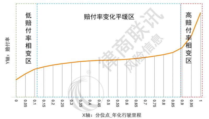 圖3:年化行駛里程分位點(diǎn)與賠付率呈現(xiàn)相變關(guān)系(新能源車為例),在高、低里程區(qū)域賠付率變化明顯,尤其是高里程區(qū)域,而約80%中間區(qū)域賠付率變化則相對(duì)平緩。本圖為基于大樣本量統(tǒng)計(jì)結(jié)果。