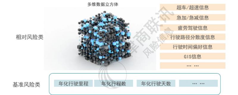 三是多維性。動(dòng)態(tài)從用數(shù)據(jù)對(duì)風(fēng)險(xiǎn)的影響可以從兩個(gè)層次來理解:一方面基于行駛里程、行程數(shù)等信息的行駛暴露類基準(zhǔn)風(fēng)險(xiǎn)。簡單地說,車輛使用越頻繁,其風(fēng)險(xiǎn)暴露越高;另一方面則反映相對(duì)風(fēng)險(xiǎn)水平,例如通過百公里超車次數(shù),百公里急加急減次數(shù)等數(shù)據(jù)來衡量。最終,基準(zhǔn)風(fēng)險(xiǎn)與相對(duì)風(fēng)險(xiǎn)共同決定從用風(fēng)險(xiǎn)。就相對(duì)風(fēng)險(xiǎn)而言,又可以細(xì)分為:“超車/超速信息”,“急加/急減信息”,“疲勞駕駛信息”,“行駛路徑分散度信息”,“行駛時(shí)間偏好信息”,以及“GIS信息”等維度。這些維度共同構(gòu)成刻畫相對(duì)風(fēng)險(xiǎn)的多維數(shù)據(jù)立方體。所以,即便能夠獲取到相同的動(dòng)態(tài)信息源,能否科學(xué)、系統(tǒng)地衍生出多維數(shù)據(jù)立方體,形成相對(duì)正交的動(dòng)態(tài)特征空間,是衡量挖掘動(dòng)態(tài)數(shù)據(jù)價(jià)值潛能能力的關(guān)鍵。