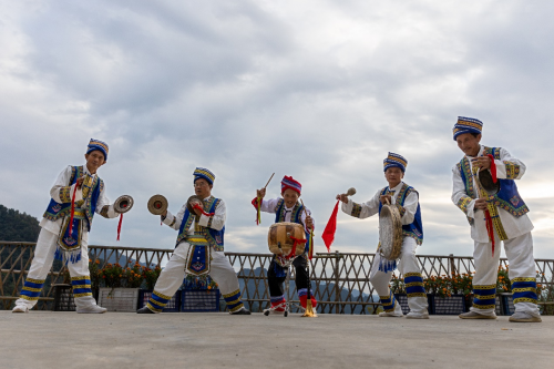 (圖為文際忠(中)與村民一起義務(wù)表演圍鼓)