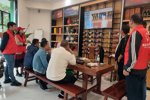 圖為“香溢”志愿者與零售戶、消費(fèi)者一同觀看反詐視頻。