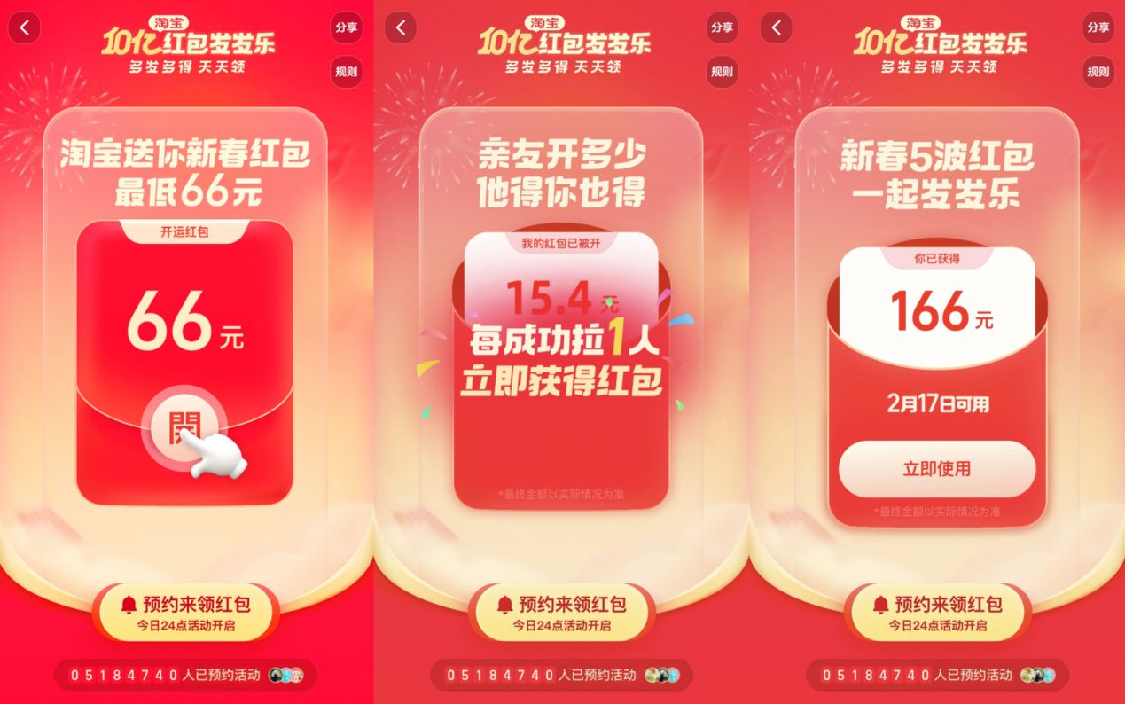 2月5日至17日,淘寶在春節(jié)期間總共會(huì)發(fā)?5 波紅包,不僅自己可以拆紅包,還能邀請(qǐng)好友一起拆紅包。好友拆多少,你就得多少,每次拉人都有紅包,無(wú)需攢滿立即發(fā)放!