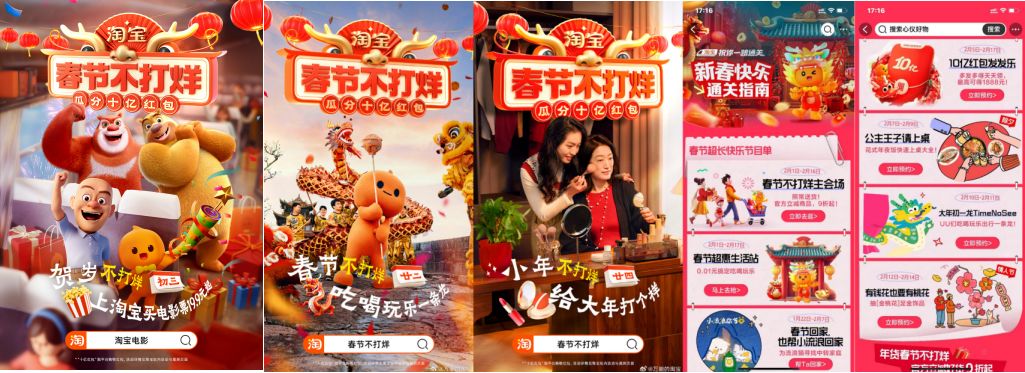 淘寶特別推出“春節(jié)超長(zhǎng)快樂(lè)節(jié)目單”,呈現(xiàn)如#公主王子請(qǐng)上桌#、#大年初一龍TimeNoSee#、#有錢花也要有桃花#等多個(gè)創(chuàng)意節(jié)日特輯,提供了更多樣化的“淘寶式過(guò)年”內(nèi)容給到消費(fèi)者,以趣味內(nèi)容設(shè)置陪伴用戶在淘寶度過(guò)好逛、好買、好玩、好看、好福利的龍年新春。強(qiáng)化了淘寶陪你過(guò)節(jié)的心智,也引領(lǐng)了春節(jié)消費(fèi)的新風(fēng)向。