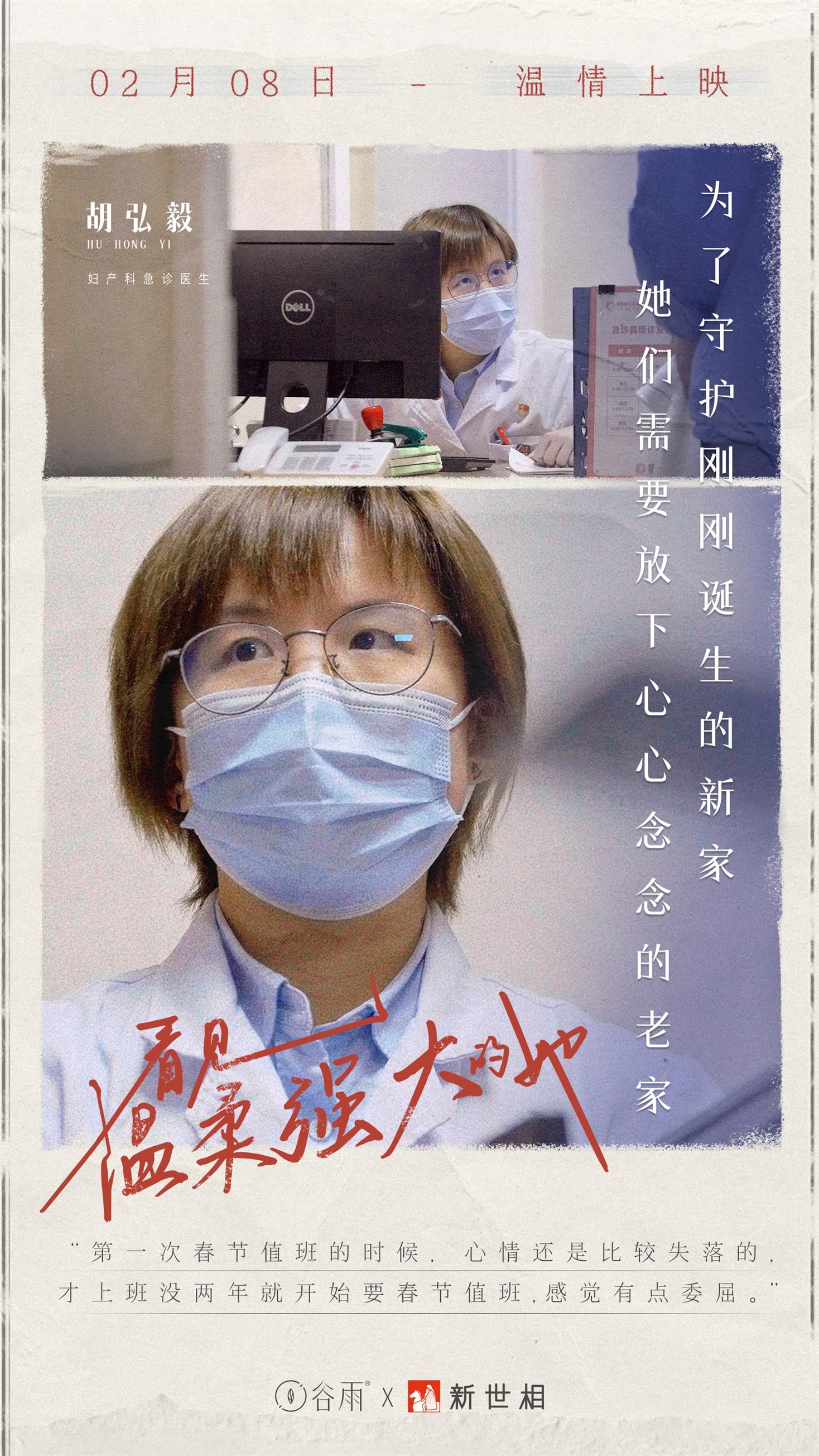 谷雨與新世相的鏡頭聚焦的三位女性工作者,她們來(lái)自不同行業(yè)不同崗位,但卻做出了同樣的春節(jié)堅(jiān)守一線的決定。她們當(dāng)中有為了守護(hù)剛剛誕生的新家,需要放下心心念念的老家的婦產(chǎn)科急診主治醫(yī)師;為了更好地照顧大家,無(wú)奈缺席自己的小家的養(yǎng)老院護(hù)工;還有為了讓我們看到萬(wàn)家,輾轉(zhuǎn)新聞現(xiàn)場(chǎng)四海為家的電視臺(tái)記者。對(duì)她們而言,即將臨盆的產(chǎn)婦、時(shí)刻需要照顧的孤寡老人、亟待關(guān)注的新聞報(bào)道......這一份份沉甸甸的責(zé)任,讓她們選擇收起內(nèi)心對(duì)家人的熱切思念,舍小家為大家,默默留守在自己的崗位上。