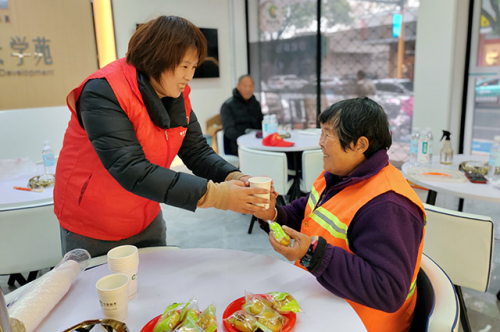 圖為“香溢”志愿者在紅色驛站為環(huán)衛(wèi)工人遞上熱水。