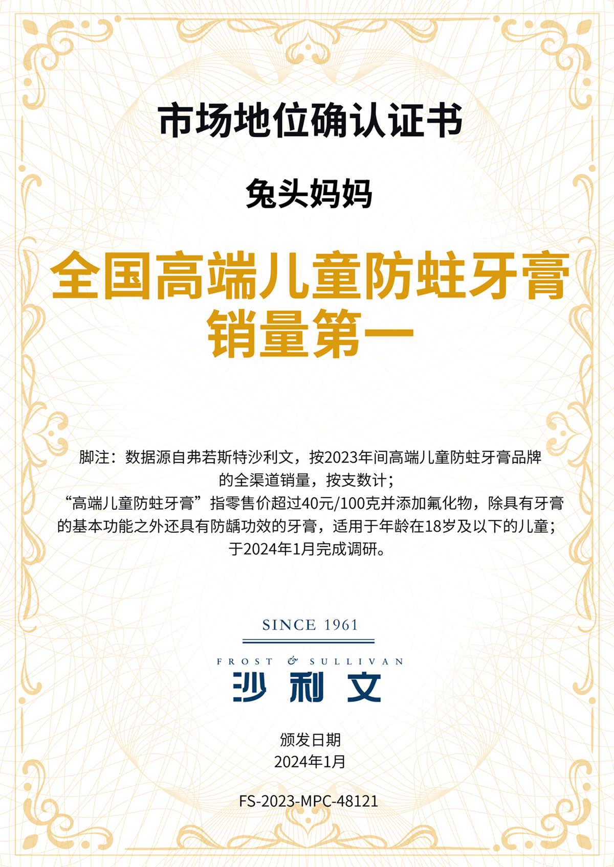 今年1月,全球知名增長(zhǎng)咨詢公司“弗若斯特沙利文”權(quán)威認(rèn)定兔頭媽媽奧拉氟防蛀牙膏為2023年“全國(guó)高端兒童防蛀牙膏銷(xiāo)量第一”。這是消費(fèi)者、市場(chǎng)、行業(yè)對(duì)品牌的認(rèn)可和信賴(lài),也是兒童口腔護(hù)理行業(yè)發(fā)展的模范標(biāo)桿。足以說(shuō)明,兒童口腔護(hù)理行業(yè)的發(fā)展必須依靠消費(fèi)者的選擇、市場(chǎng)的肯定、行業(yè)的支持。