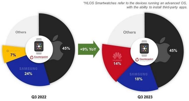 同時(shí),根據(jù)Counterpoint最新報(bào)告顯示,2023年Q3全球智能手表市場(chǎng)份額,華為手機(jī)出貨量同比增長(zhǎng)56%,以14%的市場(chǎng)份額位居全球第三。