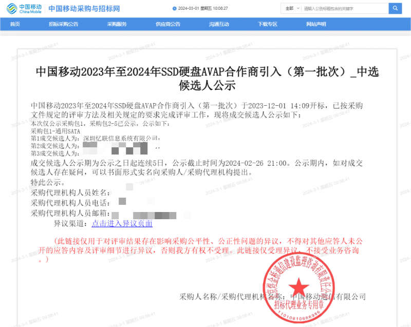 近日,中國移動公示了2023年至2024年SSD硬盤AVAP合作商(第一批次)引入項目采購包1-通用SATA的中標(biāo)候選人,憶聯(lián)以第一成交候選人中標(biāo)。