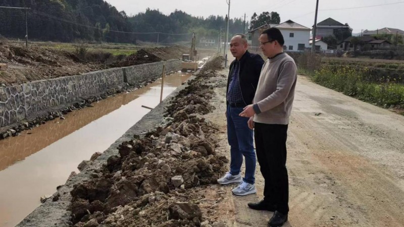 (劉家斌與駐村干部查看溝渠提質(zhì)改造工程質(zhì)量)