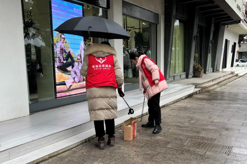圖為永康市煙草專(zhuān)賣(mài)局“香溢”志愿者正在清理路邊紙屑