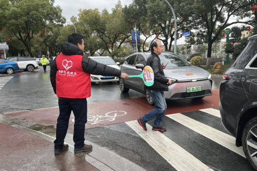 圖為永康市煙草專(zhuān)賣(mài)局“香溢”志愿者正在引導(dǎo)車(chē)輛禮讓行人