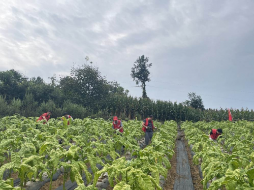 圖為:志愿服務(wù)隊(duì)員在田間抹煙芽、采摘煙葉