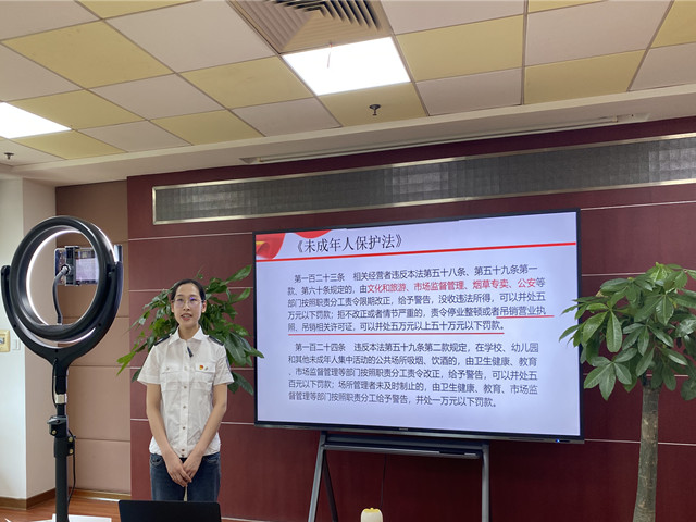 “新修訂的《未成年人保護(hù)法》已經(jīng)開始施行,里面有一些法條和我們零售戶的日常經(jīng)營息息相關(guān),必須引起注意,比如這次修訂新增了禁止向未成年人銷售煙的條款……”“云上普法直播間”內(nèi),李穎正通過案例分析、法條講解等形式為轄區(qū)零售戶宣貫新修訂的《未成年人保護(hù)法》。