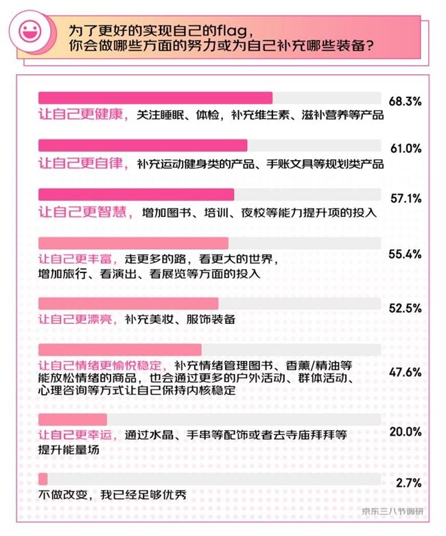 在邁向更加獨(dú)立自信的過程中,不同的女性有不同的選擇,其中“更健康”“更自律”“更智慧”是更多女性讓自己努力提升的方向。