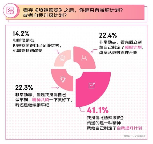 剛剛過去的春節(jié)賀歲檔,電影《熱辣滾燙》成為焦點(diǎn)話題,引發(fā)了眾多女性的共鳴。本次調(diào)研中,有41.1%的受訪者表示看完電影后很受鼓舞,并為自己制定了自我提升計劃;有22.4%的受訪者為自己制定了減肥計劃,表示“改變從身材管理開始”。